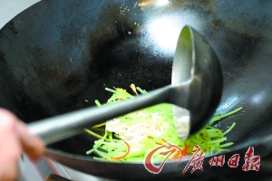 5. 油熱后爆一下彩椒,然后加入萵筍絲和生魚(yú)絲爆炒,然后用生粉兌水勾芡即可起鍋。