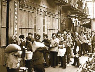 1982年,一個寒冷的冬天,人們在上海市中心的國營南市區(qū)第72號糧店門口排隊買米。排隊的人們把凍僵的雙手塞進(jìn)口袋里或縮到袖子里。隊伍很長。王文瀾攝