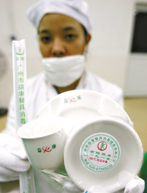 相關部門表示,將研究制定《廣州市餐飲業(yè)使用集中洗消餐具衛(wèi)生要求》和《廣州市餐具集中洗消衛(wèi)生規(guī)范》,在目前尚未有針對餐具集中消毒企業(yè)的相關法律法規(guī)出臺前,將加大監(jiān)督抽檢力度,嚴厲查處使用不合格餐具的餐飲單位。