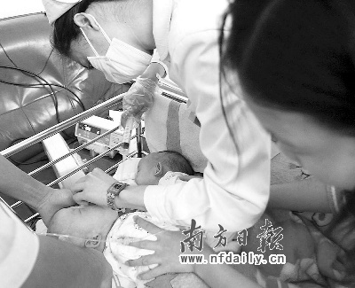 今年9月5日,化州市笪橋鎮(zhèn)一婦女產(chǎn)下一對連體女嬰。9月8日,連體女嬰被送到深圳市兒童醫(yī)院檢查治療。經(jīng)醫(yī)院檢查發(fā)現(xiàn),連體姐妹各自擁有一個肝臟,只是兩個肝臟連在一起,分離手術的成功率很大。院方?jīng)Q定前日上午9時進行手術。