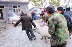 映秀鎮(zhèn)活動(dòng)板房的居民忙著熬豬油,百公里外的汶川蘿卜寨,村民們正忙著殺年豬呢。昨天早上9點(diǎn),記者剛走進(jìn)村子,就聽到豬的嚎叫,五個(gè)年輕的男子有的逮豬耳朵,有的揪豬皮,還有個(gè)抓尾巴,使出全身力氣,想讓豬乖乖就范,可那頭豬很有點(diǎn)莽勁,哇哇慘叫著直往外奔,“按!按。 必i主人袁慶彬拿著一把長(zhǎng)刀跟著攆,還一邊指揮大家用力把豬按在長(zhǎng)板凳上,五個(gè)人使出全身力氣按住,袁慶彬瞅準(zhǔn)時(shí)機(jī)對(duì)準(zhǔn)豬的喉嚨,一刀下去,一會(huì)兒血就流滿了一大盆。此時(shí)氣溫接近0℃,可他的背心居然浸出了汗,拿了一張干毛巾使勁擦。