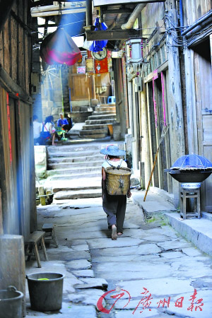 踏著青石板路,陽光透過吊腳樓的青色瓦片和綠樹灑落下來,照在正在打盹的老人和貓咪身上,落在剛出爐的金黃色的煙熏豆腐上,還有年輕女人背簍里孩子稚嫩的臉上!敖钟卸嚅L,樓有多長,晴不落光,雨不濕街”,這句當?shù)氐乃自,似乎也可以套用在我們廣州的騎樓上,不過對比騎樓,這里更顯寧靜安詳,而且有雕梁畫棟,翹角飛檐,長廊式的房檐隨街蜿蜒,整座古鎮(zhèn)全系青色瓦片蓋頂,紅漆木板竹篾夾墻,圓柱承重,古樸凝重中透出原汁原味的巴渝人家風韻。