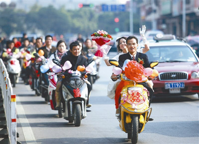 新郎陳海泉是個環(huán)保主義者,他認為騎電動車接新娘不但節(jié)約、務(wù)實還很環(huán)保。許多市民對他們的舉動表示贊揚。