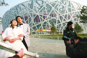 “地點什么的不重要,只要我倆能手牽手,一起走到老。”昨日,鄭廣明與身穿婚紗的妻子賀晨曦手牽手出現在鳥巢外,拍攝婚紗照。來自牙買加的游客戴文聽說了他倆的感人故事后,提出和二人合影,并送上他的祝福。