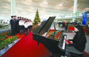 昨日(12月25日),首都機(jī)場3號航站樓內(nèi),旅客在合唱團(tuán)伴奏下跳舞。當(dāng)日,機(jī)場在2、3號航站樓增加“文化國門”系列演出,30名機(jī)場員工組成的合唱團(tuán)參演。機(jī)場負(fù)責(zé)人表示,2009年起,每逢重大節(jié)日、旅客進(jìn)出港高峰期,機(jī)場都將邀請外界演出團(tuán)體或發(fā)動內(nèi)部員工表演等,為旅客提供文化表演。(李立強(qiáng) 通訊員荊雷 攝影報(bào)道)