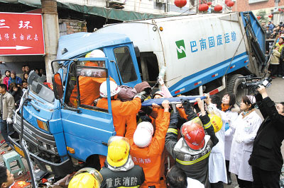 事故后不久,消防官兵和交警先后趕到現(xiàn)場。運(yùn)渣車車頭嚴(yán)重變形,消防員迅速用破拆工具救出了環(huán)衛(wèi)工人張先陽和李國華,但營救最后一個被卡環(huán)衛(wèi)工尹修正時遇上困難。尹修正的腿已經(jīng)從變形車門的裂縫中伸出車外,因其全身被卡,消防無法實施協(xié)助救援,硬拉又怕其難忍疼痛,他們只有一點一點地邊擴(kuò)張、邊移動,最后又因空間狹窄,只得用起重機(jī)將運(yùn)渣車向后拖移了20厘米,1個半小時才將尹修正救出。隨后,他被緊急送往新橋醫(yī)院。據(jù)了解,傷者全都脫離生命危險。中午12點半,運(yùn)渣車最終被運(yùn)走。此次救援工作耗時4個小時。