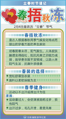 專家提醒說,立春時節(jié)乍暖還寒,公眾著裝要謹記“春捂秋凍”,慎防感冒。專家同時建議,春季健身時以不出汗或微出汗為佳。若運動量過大,則會使津液消耗過多,損傷陽氣。另外出汗過多,易受風寒。(吳艷 吳潔瑾 俞立嚴)