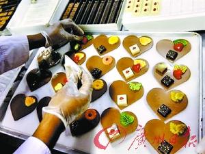 美國一家店鋪里為情人節(jié)擺出“心”形蛋糕。