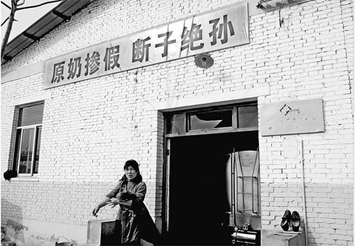 涇陽縣多家奶廠,近日都貼出同樣內(nèi)容的一條雷人標(biāo)語:“原奶摻假,斷子絕孫”。涇陽縣蔣路鄉(xiāng)澳西牧場63歲的飼養(yǎng)員董學(xué)文說,看到這個標(biāo)語就不舒服。張貼標(biāo)語的公司希望各方面汲取三聚氰胺事件的教訓(xùn),標(biāo)語的目的在于警示,也表明企業(yè)抓質(zhì)量的態(tài)度。牧場總經(jīng)理梁軍表示,他能理解公司這么做的初衷,但內(nèi)容值得商榷。(魏光敬 謝勇強攝影報道)