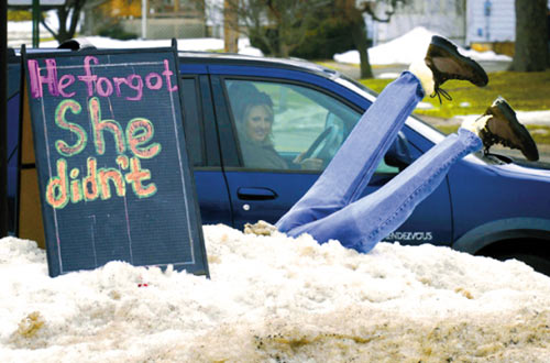 美國(guó)俄亥俄州謝爾比,一名開車路過(guò)的女子被這一幕逗笑了:情人節(jié)前夕,一家花店外的一堆雪里,一名男模特人造模型的腦袋扎進(jìn)雪堆里,只露兩條腿,旁邊一塊黑板上用粉筆字寫著“他忘記了(情人節(jié)),但是,她沒(méi)有”,幽默地表達(dá)一個(gè)忘記在情人節(jié)給女友或者愛(ài)人買花的男人被扔出去的可憐下場(chǎng),充滿創(chuàng)意。
