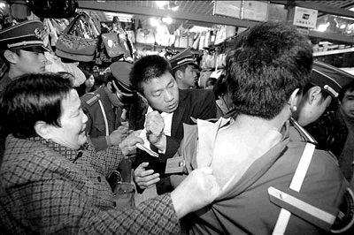 因售假受到封攤處罰,秀水街市場攤主與管理方的矛盾愈演愈烈。15日,秀水街市場對第三批8個被控售假的商戶進(jìn)行封攤處理。其間,封攤?cè)藛T遇到了攤主及其“親友團”的殊死抵抗;一老太太還在地上打滾,堅決不讓保安靠近自己兒子的攤位。