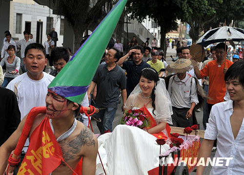 當(dāng)日,在廣西南寧市白沙大道,從湖南邵陽市來南寧工作的新郎毛文旻(前左一),身著奇裝異服,用“!崩遘嚨姆绞接⑿履,引起眾多市民的圍觀。據(jù)毛文旻從湖南邵陽老家趕來參加婚禮的親友介紹,這種迎親方式是他們的傳統(tǒng)婚俗。新華社記者 周華 攝