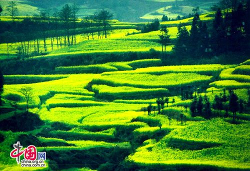 金色的山崗、金色的溝壑、金色的原野、金色的河堤、金色的花壇、金色的盆景,金色鋪設(shè)了羅平的山山水水,羅平成了金色的世界。