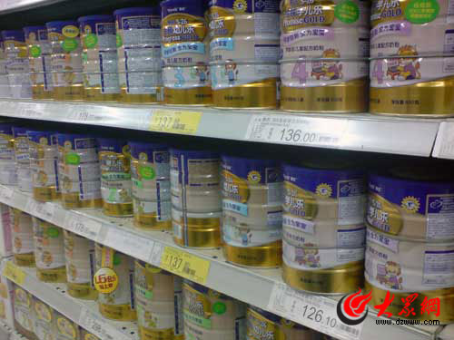 24日上午,記者在大潤發(fā)歷下店和濟(jì)南銀座商城的奶粉柜臺(tái)看到,惠氏奶粉仍然擺在貨架上,價(jià)格也未發(fā) 生變化;而在家樂福超市,記者看到惠氏奶粉已經(jīng)被擺上了促銷柜臺(tái)的顯著位置,記者注意到,惠氏2段S26金 裝健兒樂900克聽裝奶粉當(dāng)天售價(jià)仍然是178元,而惠氏3段S26金裝健兒樂900克聽裝奶粉售價(jià)已從155.8元直降 到137.8元,降幅達(dá)到18元。銷售人員告訴記者,惠氏被曝光的事她已經(jīng)知道,但并未接到下架通知,盡管她表示惠氏降價(jià)與“結(jié)石門”無關(guān),但記者從價(jià)格標(biāo)簽上看到,降價(jià)銷售的標(biāo)簽是24日當(dāng)天新?lián)Q的;在沃爾瑪超市,記者看到惠氏同樣在降價(jià)促銷,降幅與家樂福相同。