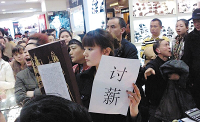 “三八”節(jié)本該是婦女的節(jié)日,然而這一天重慶解放碑鬧市某商場卻出現了一名漂亮女子舉紙條討薪維權的場面,驚動了110民警。原來,這名討薪女子是廣州一家公司駐該商場的營業(yè)員,因未接待顧客被公司罰款100元,拒交后又遭到調崗處理。雙方關系“拉爆”后,遂來到商場追討千余元欠薪。昨天,經渝中區(qū)勞動局介入,當事雙方已達成協議,公司方面支付了她3年多的保險金,欠薪也即將支付。