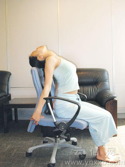 動(dòng)作要領(lǐng):坐在椅子二分之一處,雙手向后彎曲,握住椅子背部。身體保持正直,兩肩向后擴(kuò)展打開,收腹,呼氣上背后仰,胸部盡量向前挺起,頭部放松靠在椅背上,眼睛注視天花板或閉上雙眼,保持此姿勢10秒鐘。