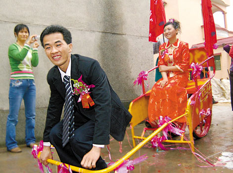 當日下午2時左右,石頭村接龍橋到慈灣村的小道上,鞭炮齊鳴,笑聲不斷。西裝革履的新郎正奮力拉著一輛自制的兩輪人力車,人力車上端坐著漂亮的新娘,紅彤彤的禮服映紅了新娘的臉。新郎是棠下鎮(zhèn)石頭村委會慈灣村人,在棠下工業(yè)區(qū)的一車廂廠工作,新娘是環(huán)市街道辦丹灶村人,兩人已經(jīng)相識一年,當日喜結良緣。