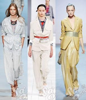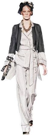 09春夏,Dolce&Gabbana以男式睡衣為靈感,把我們所熟悉的睡衣搬到舞臺上,經(jīng)過改良變成時裝,尤其是褲子結(jié)構(gòu)的創(chuàng)新,這種寬邊褲腳勢必會流行于2009年春夏。這個款式使用具有光澤感和垂感極好的面料,并采用灰白豎條圖案,而這種豎條圖案面料本身就是簡潔韻味的標(biāo)志性符號!八绿籽b”外搭一個黑色小外套,渲染出別具韻味的時尚氣息,美不勝收。而簡潔的款式與閃耀的項鏈搭配相得益彰。還有手中的包包配有金屬鏈條具有很強的裝飾感。