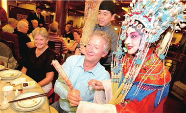昨晚7點(diǎn),在前門全聚德烤鴨店,京劇、川劇變臉和老北京的糖葫蘆,讓來自美國的130余名游客感受了一把地道的中國風(fēng)。而這也是今年以來,該店接待人數(shù)最多的一個外國旅游團(tuán)隊(duì)。(記者范繼文 胡笑紅攝影報(bào)道)
