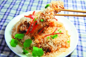 材料:特級(jí)肋排(2根,360克)、糯米(250克)、紅椒(半只)、蔥花(1湯匙)