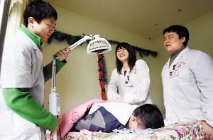 去年12月,劉瑞和周陽回到重慶,開始四處尋找合適的鋪面,“我們遇到很多好心人,知道我們是大學(xué)生,都是盲人,很多人主動站出來幫我們!敝钢40多平方米的小診所,劉瑞說,房東王艷在從朋友口中知道了三人的遭遇后,主動把自己的房子低價租給他們,并免去前三個月的房租,鼓勵三人創(chuàng)業(yè)。