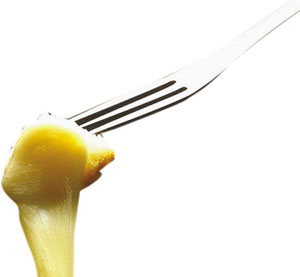 “奶酪火鍋”是瑞士最普遍、最具盛名的火鍋之一。瑞士人制作“奶酪火鍋”一般都是先以蒜涂抹于鍋底,再將不同口味的硬奶酪擦成碎末放入鍋中加熱成糊狀,再加淀粉、白葡萄酒、大蒜、奶油等,繼續(xù)煮并慢慢攪拌至完全融化呈濃濃的煉乳狀,最后放進一些黑胡椒即可。上桌后,人們用長柄叉子叉著切成四五厘米見方的“法式長棍面包”蘸著奶酪吃,很像中國的“拔絲香蕉”。此外,吃這種火鍋時,瑞士人還特別喜歡配上有助于清口的風干牛肉、腌酸黃瓜、小洋蔥。不過,吃這種火鍋一定要“點到為止”,雖然奶酪富于營養(yǎng),但很難消化,用白葡萄酒融化奶酪,就是為了幫助消化。