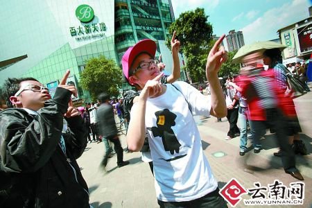 昨天(4月12日)下午1點40分左右,這些年輕人就開始在昆明南屏步行街廣場前聚集,大家三三兩兩地在一起說說笑笑。2點10分左右,突然傳來了一聲哨響,剛剛還在走來走去的人群突然不動了。動作甚至表情都僵硬不變。這一突發(fā)狀況也嚇壞了很多路過的市民,王女士表示:“當(dāng)我發(fā)現(xiàn)周圍的人都突然不動了的時候,我一下覺得很恐怖,想這是什么陰謀?!”一些老人也非常不理解:“這些年輕人怕是都約好的了,全部在這里擺造型,一個二個表情還多嚴肅,我還以為是出了多大的事,被嚇著了!