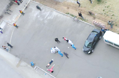 昨天,該校一名現(xiàn)場(chǎng)目擊者陳姓學(xué)生透露,先聽到有一男一女的爭吵聲,接著聽到一個(gè)女生的嘶喊聲,后來就看到一女一男先后從公寓樓墜下。當(dāng)天下午6:40左右,北京朝陽警方迅速封鎖現(xiàn)場(chǎng),展開調(diào)查。另一目擊者說,當(dāng)晚6:20,一名女生從靜思苑13層?xùn)|南側(cè)樓梯窗口墜下,5分鐘后男生從同一位置墜下。墜樓后,兩人橫躺在宿舍樓南側(cè)的地面上,女生穿粉紅色睡衣,男生光著上身,下身穿牛仔褲,身下有大片血跡。原來,兩人墜樓的窗臺(tái)高約1米,窗戶面積不足1平方米,窗戶的紗窗已被撕開,一件藍(lán)色運(yùn)動(dòng)上衣還留在窗臺(tái)上,附近地面上還有數(shù)根煙頭,該樓一層?xùn)|側(cè)入口處的欄桿也被砸斷!