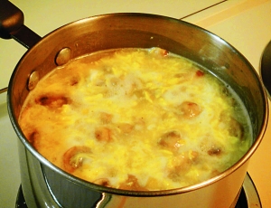 3. 把土豆蓉、玉米粒、蘑菇和4碗水倒入鍋里,煮至熟;