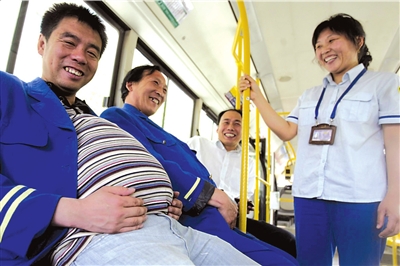 昨天上午,在北京站東街的639公交車總站內(nèi),突然多了很多“孕婦”集中乘車。為迎接母親節(jié)的到來,車隊(duì)讓男司乘人員假扮孕婦,體驗(yàn)當(dāng)母親的辛苦。