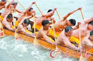 作為主辦方,聚龍村村長周廣耀說。如今已經(jīng)提出“廣佛同城”,我們計劃從今年起將“世代同飲一江水,獅舞龍騰賀同城”作為今后龍舟賽的口號。據(jù)悉,由于今年是廣佛同城第一年,前來聚龍村的龍舟也較往年多,共有32條,10條來自荔灣區(qū)的山村、海北村等,一條來自白云區(qū),其他來自鹽步橫江、聚龍、大瀝謝邊及黃岐等地。在這些龍舟中,其中6條僅游河,26條參加比賽。