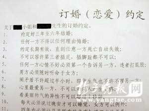 記者看到,“戀愛協(xié)議”中醒目地寫著“吃飯前必須默念對方的名字一次”、“不可以容許第三者插足,插腳趾都不可以”、“約會時女方的一些瑣事交給男方處理”等35條內(nèi)容。末了還注明了男(女)簽約人、證明人和簽約時間,并特別規(guī)定:“單方面撕毀無效,涂改無效”、“約定長期有效,直到任意一方死亡自動失效!辈簧偻瑢W聽說此事后,紛紛表示“真的被雷倒了”。