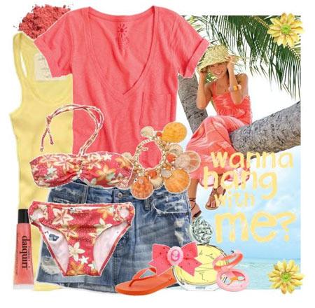 西瓜紅色T恤搭配牛仔裙,海邊風情的色彩搭配,T恤里面可以搭上同色系的花朵比基尼。