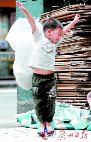 天成路。來自河南的小家伙在媽媽收購來的紙箱旁跳舞。