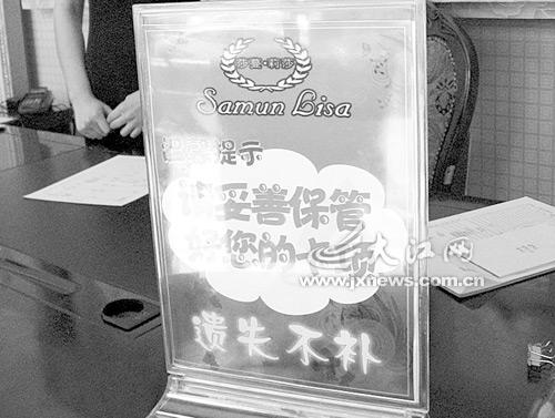5月31日,記者陪同蔣女士來到莎蔓莉莎美容院。記者注意到,莎蔓莉莎美容院前臺(tái)擺放的提示牌十分醒目,上面注明“請(qǐng)妥善保管好您的卡項(xiàng),遺失不補(bǔ),最終解釋權(quán)歸莎蔓莉莎美容院”。