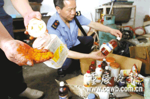 記者現(xiàn)場(chǎng)看到,該作坊位于一棟3層民房?jī)?nèi),1樓專(zhuān)門(mén)設(shè)計(jì)了一個(gè)狹長(zhǎng)的車(chē)庫(kù),打開(kāi)卷簾門(mén)可以直接將貨車(chē)倒入房間內(nèi)裝貨,非常隱蔽。3樓除了工人生活房間外,有一間房里堆滿(mǎn)各種包裝紙箱、包裝袋,以及已經(jīng)使用過(guò)的各種不明食品添加劑,估計(jì)其中可能有日落黃、檸檬黃等國(guó)家限制使用的色素以及燒堿等。執(zhí)法人員將色素瓶蓋打開(kāi),鮮艷的色素很快染紅了執(zhí)法人員的雙手。雷所長(zhǎng)介紹,這些色素具體是什么成分,可否添加入食品,食用后對(duì)人體有無(wú)害處還有待技術(shù)檢驗(yàn)。