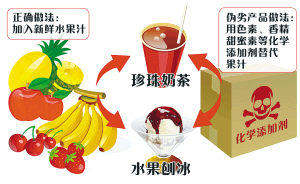 據(jù)介紹,正宗的珍珠奶茶應(yīng)該是用水果為原料制成,比如椰果珍珠奶茶應(yīng)該由椰子水發(fā)酵,再加入菠蘿水等混合而成。正宗的刨冰是將冰塊刨成雪花,再配以各種水果和其他配料及果汁制成,吃起來(lái)口感細(xì)膩,入口化渣。