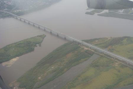 這是從飛機(jī)上航拍的哈巴羅夫斯克市內(nèi)的阿穆?tīng)柡?黑龍江)大橋,這不是界橋,這一段的阿穆?tīng)柡邮嵌砹_斯的內(nèi)河。