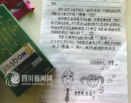 文中這樣寫道:“首先祝您父親節(jié)快樂,我今天送您一個特別的禮物,希望您不要生氣哦!知道您經(jīng)常在外應(yīng)酬,還要經(jīng)常出差,為這個家又當(dāng)?shù)之?dāng)媽。為了您的健康也是為了您的生活更快樂,我悄悄幫您買的最新款的TT哦!以前偷偷看到您的抽屜里是這個牌子的……”言語中,透露出女兒對父親的感激之情。最后,女兒還俏皮的說“希望您接受女兒的一片心意。!哈哈……在此祝您節(jié)日快樂!也希望您能早點找個漂亮的女朋友哦,嘻嘻……放心,我不會給媽媽說的!”小女孩通篇用語樸實無華,天真無邪,讀來讓人感動。
