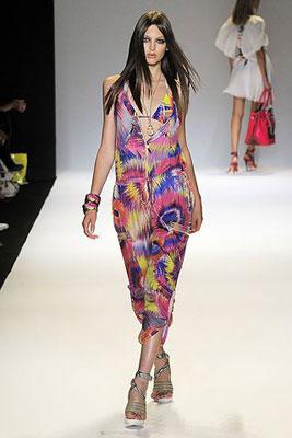 英國著名服裝設(shè)計師Matthew Williamson本季帶來了色彩斑斕的連體衣,嫵媚動人。甜蜜而繁復的扎染印花是夏天的味道,飽和的色彩,肆意的視覺刺激充滿異國情調(diào)。長至小腿中部,超低V領(lǐng)的簡潔廓形又有些嬉皮味道的調(diào)侃。這樣的連體衣,要避免繁榮復雜的細節(jié)搭配,簡單的配飾就足以讓你成為焦點。