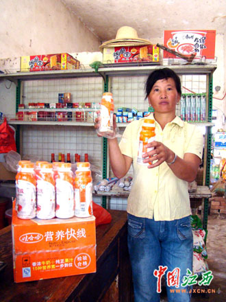 當(dāng)日上午,記者驅(qū)車來(lái)到墩上村實(shí)地采訪。今年41歲的鄒根枝兒女都在外務(wù)工,和丈夫鄒新海兩人在家?guī)腿搜b殼子板,每天120多元的收入讓兩人很是滿足,平時(shí)除了吃飯外還特意買些原料補(bǔ)充營(yíng)養(yǎng)。鄒根枝介紹說(shuō):“6月20日,我從墩上村鄒德水的便利店里買來(lái)一箱娃哈哈營(yíng)養(yǎng)快線,當(dāng)時(shí)怕飲料不新鮮,還特意看了生產(chǎn)日期,見是2009年5月31日生產(chǎn)的才放心買了回去,放在家里晚上看電視的時(shí)候喝,有些時(shí)候我老公(鄒新海)也喝一瓶,但沒(méi)有我喝得多。幾天后,我感覺(jué)肚子不舒服,上吐下瀉,為此專程搭車到萬(wàn)年縣石鎮(zhèn)街去買胃藥,花了差不多200元錢病情卻不見好轉(zhuǎn),而且肚子痛得特別厲害。沒(méi)有辦法,我只好到屋前的墩上衛(wèi)生所去看病,打了幾天吊針以后病情才有所好轉(zhuǎn)。這次看病不僅花費(fèi)了近400元醫(yī)藥費(fèi),還耽誤了一個(gè)多星期沒(méi)有干活,就連前兩天插秧都是請(qǐng)人干得,我的損失可大了!