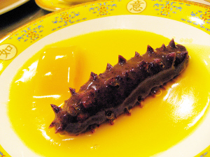 這種餃子太獨(dú)特了,是花樣餃子的一種,尤其是遼參餃,它是餃子宴以現(xiàn)代時(shí)尚形式開(kāi)席的第一道,褐色晶亮澆著汁的遼參一上桌就驚艷四座,要不是吃心不改提前就知道,也許會(huì)驚呼出來(lái),真的太像了,幾乎毫無(wú)破綻。這遼參餃外皮是黑米面,是如今最流行的甜餃子面皮,遼參的刺兒是用剪子剪出來(lái)的,主廚還嫌這次的刺兒剪得太有規(guī)律了,有點(diǎn)不像了,面皮里面的餡是什錦豆沙,一點(diǎn)都不甜膩,外澆的是橙汁,配菜是南瓜,真是一道養(yǎng)眼開(kāi)胃又能帶來(lái)驚喜的餃子呀!其實(shí)它是蒸餃的一種,而且還可以換芝麻芋泥、八寶雪梨、五仁山楂等其他甜餡兒,但是要提前預(yù)訂。