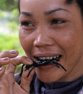 柬埔寨有種獨(dú)特的食物——油炸毒蜘蛛。這種蜘蛛主要產(chǎn)于中部的磅通省,以其肥碩、美味而著名。其他省份也有出產(chǎn),但比磅通的略遜一籌。毒蜘蛛不像我們常見的蜘蛛凌空結(jié)網(wǎng)而居,而是生長(zhǎng)在地下,挖穴棲身,以吃草根果腹,抓它們要掘地三尺。每年4月中旬是毒蜘蛛最多最肥的時(shí)候,捕食蜘蛛當(dāng)以此時(shí)為佳。