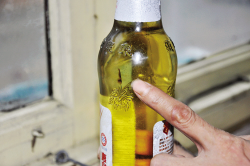 黃先生的餐館開在福清漁溪鎮(zhèn),昨日,在餐館里記者看到這瓶啤酒,其瓶蓋仍完好無損,上面標(biāo)注著生產(chǎn)日期為“2009年7月16日”,尚在保質(zhì)期內(nèi),生產(chǎn)商是福建燕京惠泉啤酒股份有限公司,啤酒瓶內(nèi)漂浮著兩個指甲大小的“蝌蚪”狀黑色物質(zhì)。一名顧客說:“真惡心!”