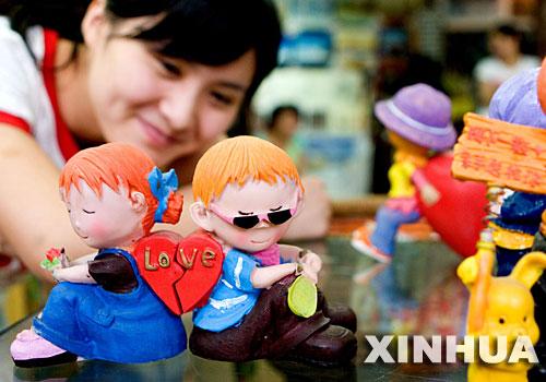 7月24日,一名女孩在淮北一家工藝品店欣賞情侶玩偶。