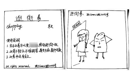 “逛街券”:只能使用半天,出示此券,不愛逛街的小王必須乖乖就范,陪小李逛街。