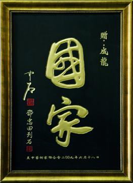 纖維玉石雕刻的書法作品《國家》是由中國知名雕刻家、書法家邵忠田先生特別雕刻制作,并贈送給成龍先生的。據(jù)了解,纖維玉石是一種鮮為人知的礦石,孕育在位于長江和黃河之間的秦嶺深處,這種特殊玉石歷經(jīng)幾億年形成,深埋地下,柔軟如膠,一經(jīng)開采出來,迅速變得致密堅硬,質(zhì)地細膩,溫潤光澤,是雕刻方面的最佳選材,迄今未在世界其他地方發(fā)現(xiàn),極具收藏價值。