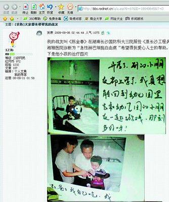 “我的戰(zhàn)友叫陳金春……三級士官轉(zhuǎn)業(yè),現(xiàn)在他的小孩被……診斷為‘急性淋巴細(xì)胞白血病’希望得到愛心人士的幫助!苯衲9月6日,戰(zhàn)友在某網(wǎng)站論壇上為陳金春女兒發(fā)出求助帖。不少網(wǎng)友打電話咨詢情況,并郵寄財(cái)物幫助小飛月。