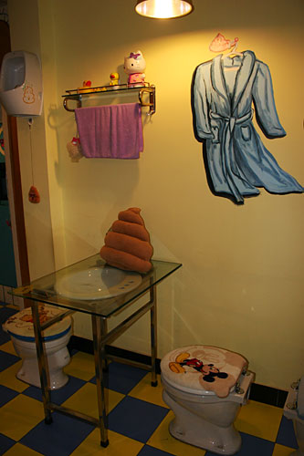 小小的門面,狹窄的樓梯。走上二樓后,這個(gè)布置得充滿了童趣的餐廳才展現(xiàn)在食客面前。這里的每把座椅都是一座標(biāo)準(zhǔn)的沖水馬桶。盛放主餐的不是盤子,而是微型馬桶,冷飲則大都放在“蹲坑”形狀的便器里。好在這些餐具造型卡通,并不會(huì)讓人大倒胃口。