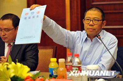11月30日,農(nóng)夫山泉股份有限公司董事長鐘睒睒在新聞發(fā)布會上展示有關(guān)部門出具的同批次產(chǎn)品的檢驗合格報告。新華社記者王定昶攝
